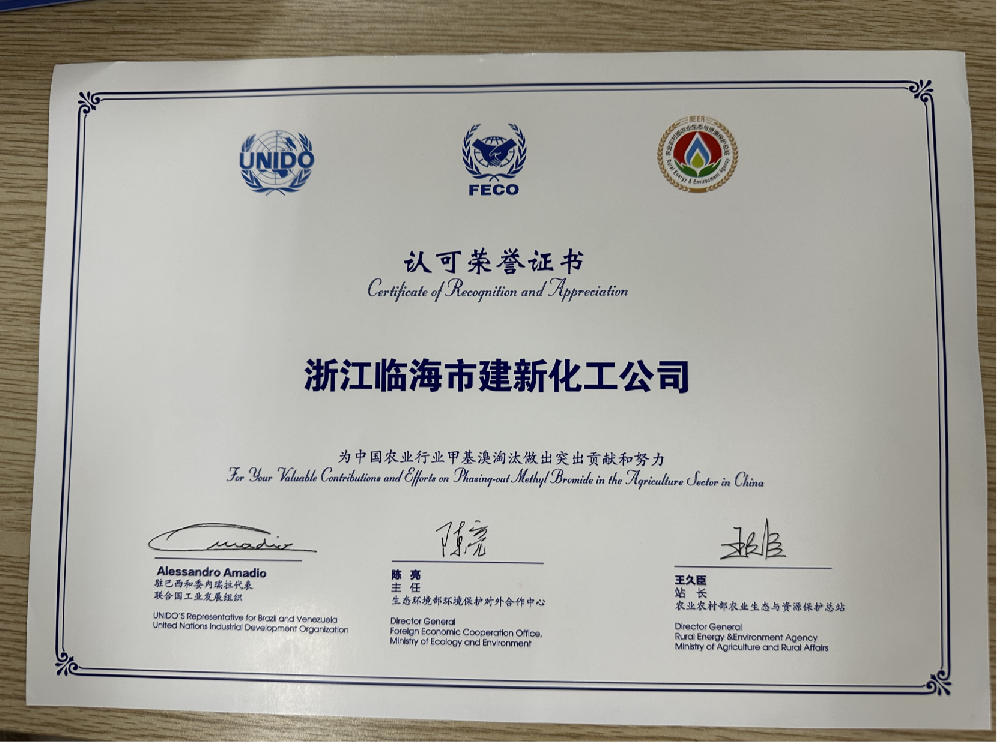 聯(lián)合國證書(shū):為中國農業(yè)行業(yè)甲基溴淘汰做出貢獻和努力